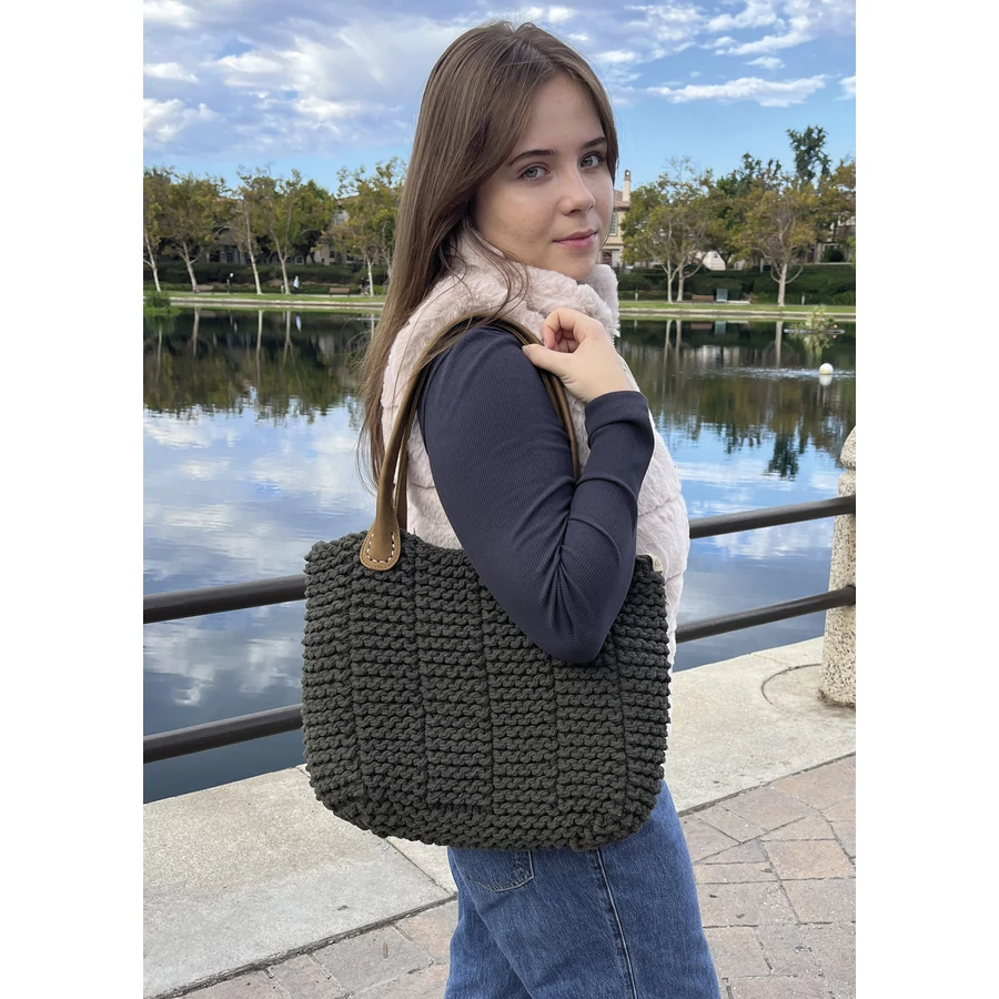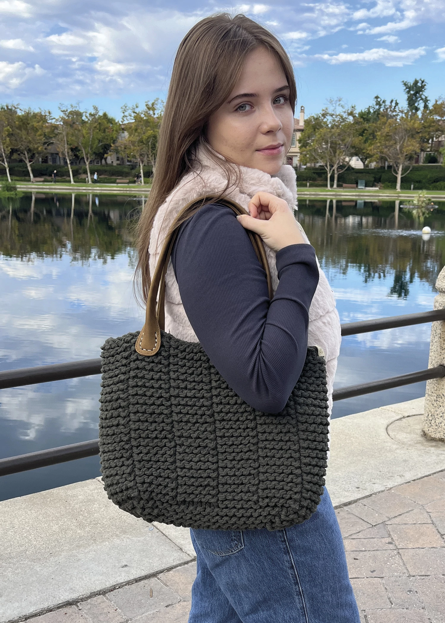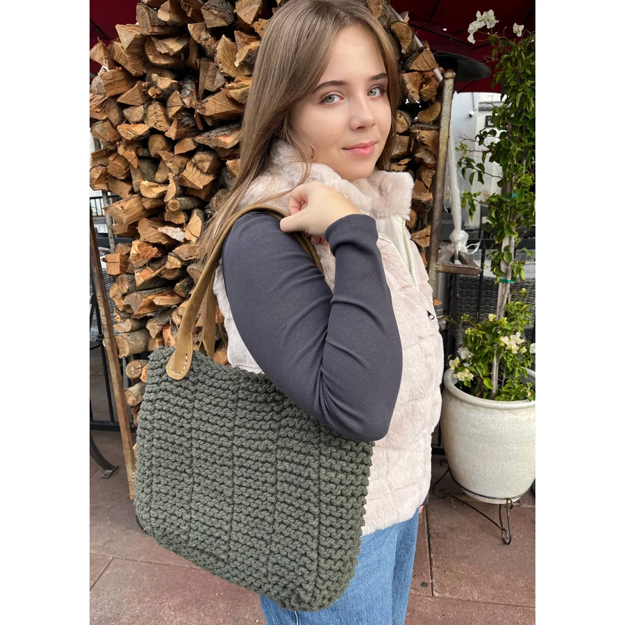 Tote táska minta, keki makramé 5 mm, kézműves bőr füllel
