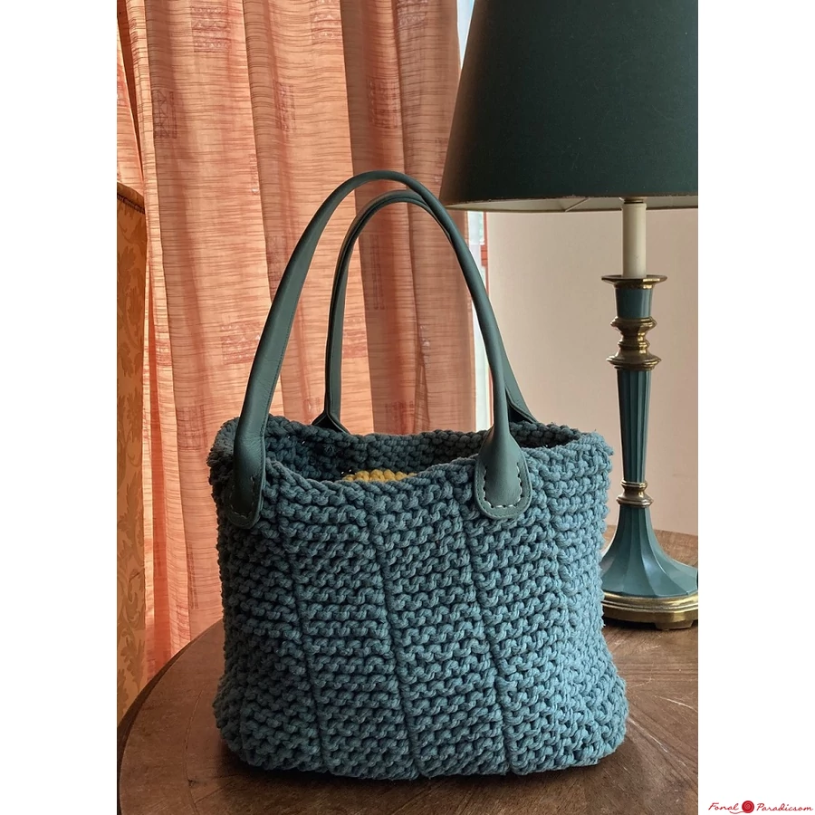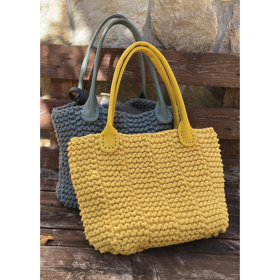 Táskatest: 4 gombolyag keki zöld 121 Anchor Crafty 5 mm vastag makramé fonal, (80% újrahasznosított pamut, 20% újrahasznosított poliészter; 40 m/250 g); vagy 4 gombolyag napsárga (022) vagy zöld, (065) Schachenmayr Macramé 5 mm vastag makramé fonal (80% pamut, 20% poliészter; 40 m/250 g); 8-as, 80 cm-es körkötőtű, nagy fokú tompa varrótű, erős varrócérna (bőrvarrócérna) a fülek felvarrásához, olló.