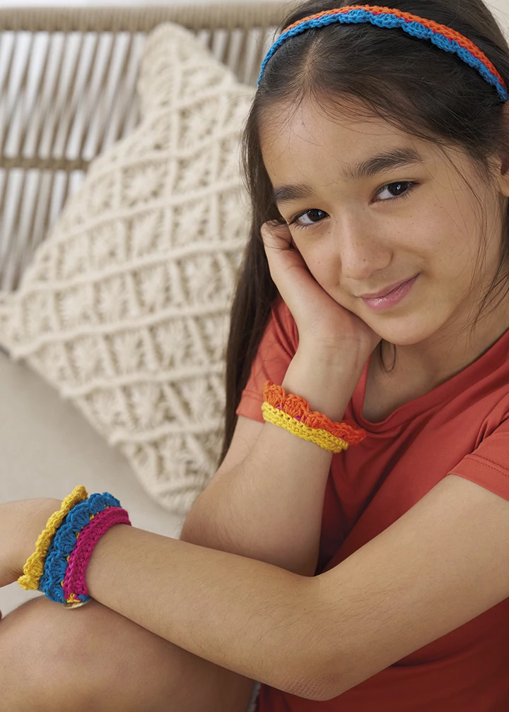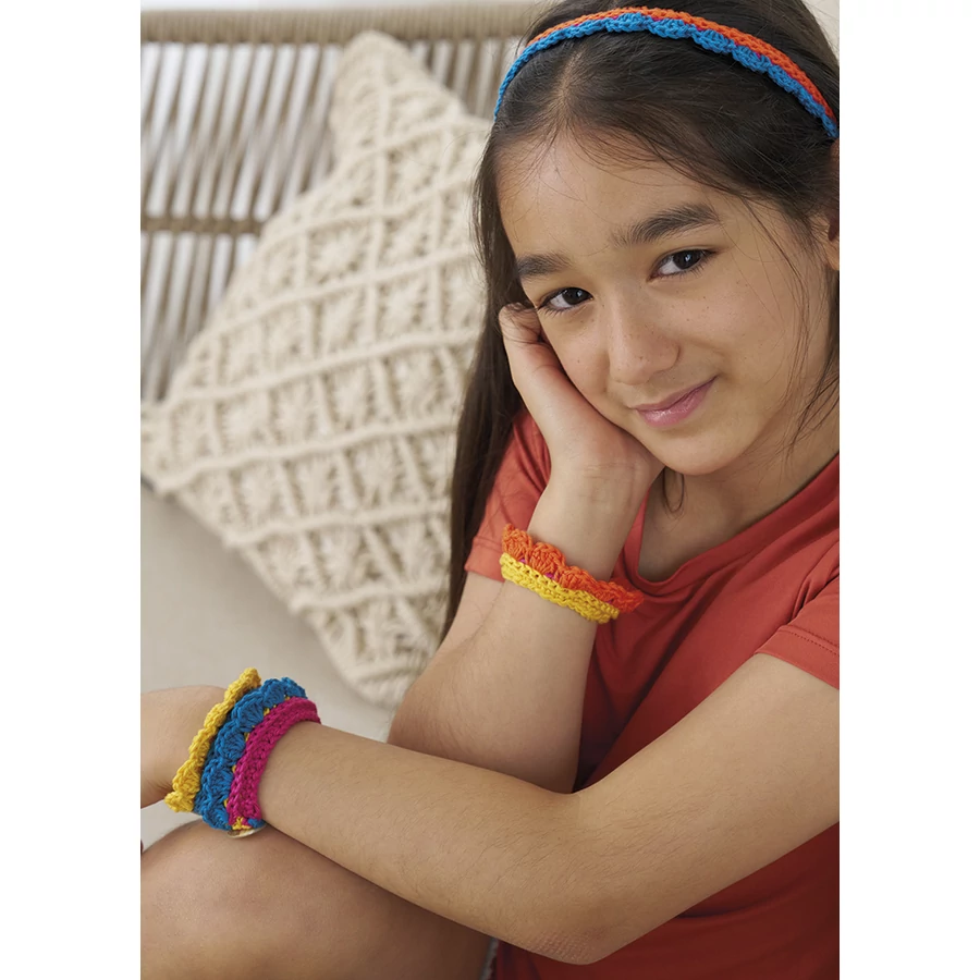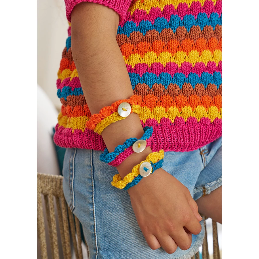 maradék Schachenmayr Catania fonalak (100% pamut; 50 g/125 m): A) színváltozat: ciklámen (00114), nap (00208), óceán (00400); B) színváltozat: nap (00208), óceán (00400), rókabarna (00426); C) színváltozat: ciklámen (00114), jaffa (00189), nap (00208); 3-as horgolótű, 1 kis gomb, gyapjúvarrótű