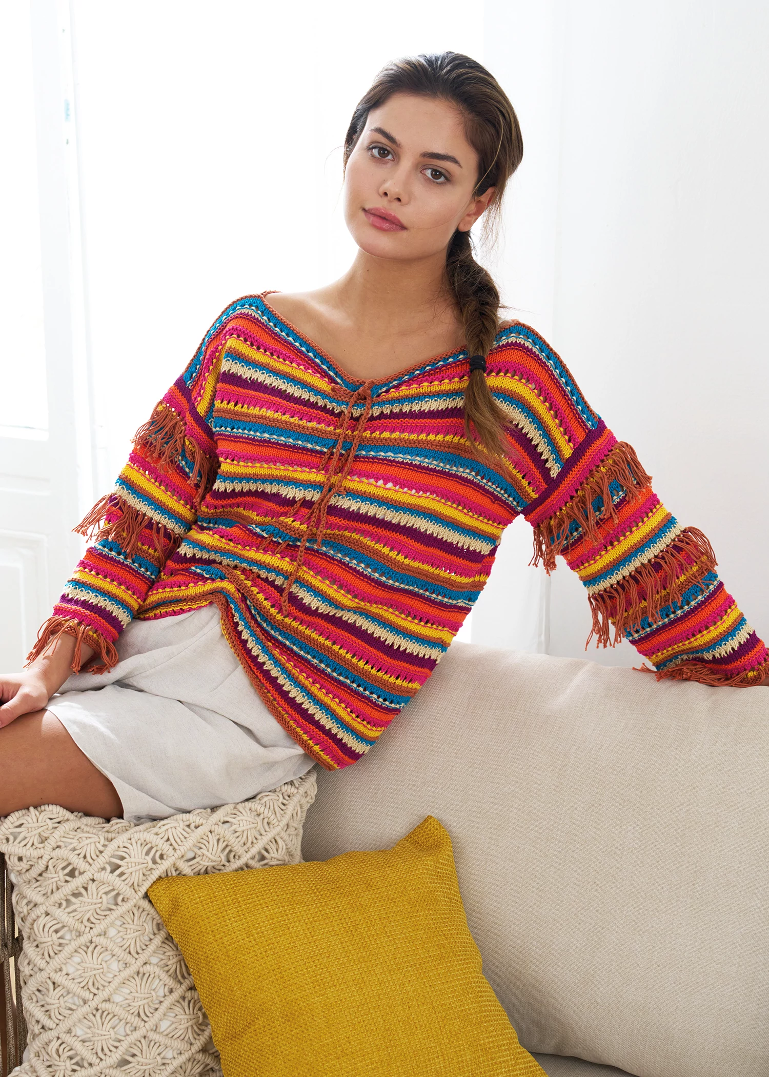 A szín- és mintaváltások sorrendje: kezdés: +3 sor lustakötés: rókabarna; – *2 sor sima kötés: nap; – 2 sor lyukminta: ciklámen; – 2 sor simakötés: ciklámen; – 2 sor fordított kötés: jaffa; – 4 sor simakötés: fukszia; – 2 sor lyukminta: homok; – 2 sor simakötés: homok; – 2 sor patentminta: óceán; – 2 sor lustakötés: rókabarna; – 4 sor simakötés: nap; – 2 sor lyukminta: ciklámen; – 2 sor simakötés: ciklámen; – 4 sor simakötés: jaffa; – 2 sor fordított kötés: fukszia; – 2 sor simakötés: homok – 2 sor lyukminta: óceán; – 2 sor simakötés: óceán; – 4 sor lustakötés: rókabarna* A *-tól *-ig terjedő mintaszakaszt folyamatosan ismételjük. A szálváltásoknál a fonalat a munka szélén vezessük.