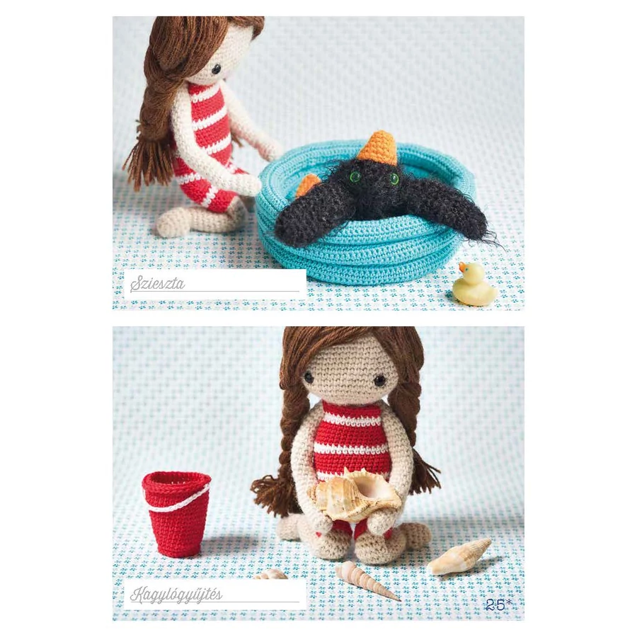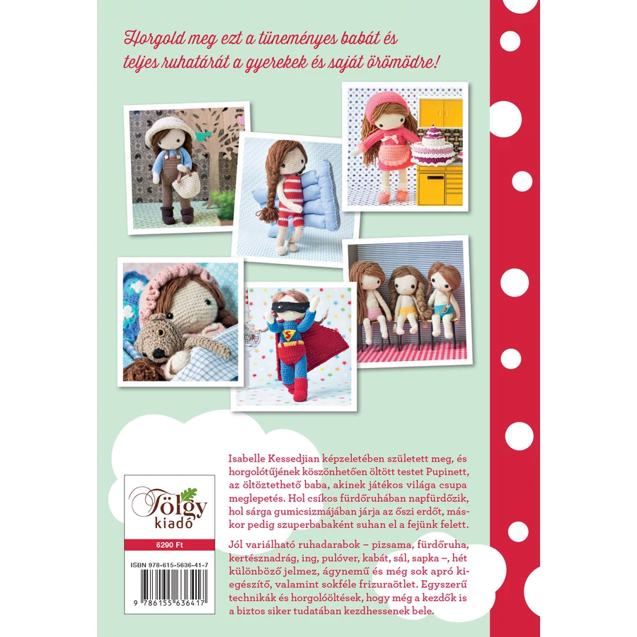 Isabelle Kessedjian képzeletében született meg, és horgolótűjének köszönhetően öltött testet Pupinett, ez a bájos horgolt baba, akinek játékos világa csupa meglepetés. Hol csíkos fürdőruhában napfürdőzik, hol sárga gumicsizmájában járja az őszi erdőt, máskor pedig szuperbabaként suhan el a fejünk felett.Csupán a legegyszerűbb technikákat és horgolóöltéseket kell ismerni a baba, a ruhák és a rengeteg kiegészítő elkészítéséhez. A színpompás, apró holmik a kezdőknek is biztos sikert ígérnek.